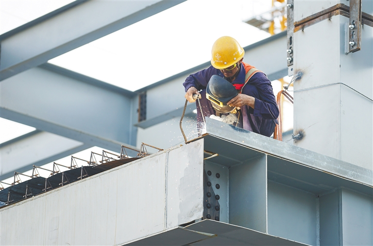 12月16日,在三亚中交国际自贸中心项目工地,施工人员正在焊接钢结构。据悉,该项目计划总投资额逾32亿元,目前建设进度已近半,计划2023年4月竣工,建成后中交海南区域总部将进驻。 本报记者 武威 摄