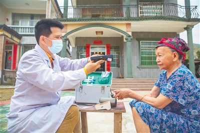 “村医通”便民服务工程是依托互联网技术构建的农村卫生室医疗保障结算系统,打通了镇卫生院和农村卫生室两级医保报账通道。同时,“村医通”智能服务终端还与人社、税务等部门相连接,村医可以直接在智能服务终端开具药品清单,打印结算清单,并现场实时结算,参保群众足不出户就能完成医保报销手续。目前,海南省“村医通”便民服务工程项目已通过验收,全省已有358个乡镇卫生院、64个社区卫生服务中心(站)、2325个村卫生室配备了功能多元的“村医通”智能终端。