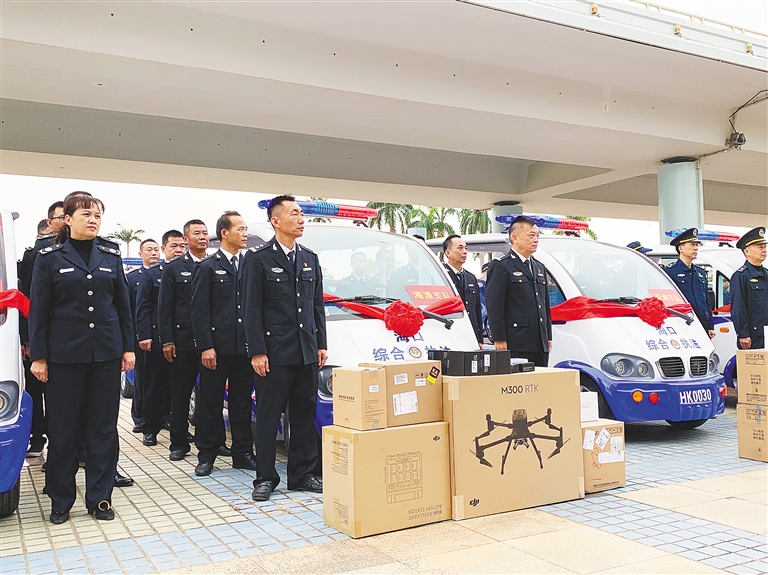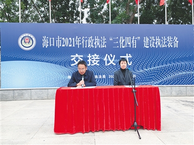 交接仪式上,海口市综合行政执法局相关负责人宣布执法装备分配方案,强调执法装备的使用和注意事项,要求各单位要进一步严格规范执法装备的管理与使用。