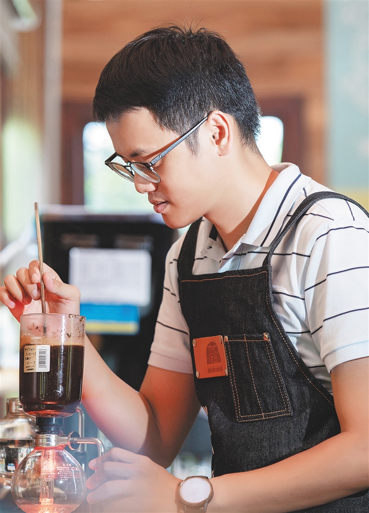 曾威懋传承了父亲身上那股子闯劲。2013年,他辞去收入稳定的工作,在众人不解的目光中返乡创业,开始学习制作咖啡。要做出一杯好喝的咖啡,每一道工序都有讲究。曾威懋不断尝试、总结、改进,提高手艺。“晾晒咖啡浆果,连皮带壳存放半年,均匀烘焙咖啡豆21分钟,再养豆7天,直到咖啡豆处于最理想的状态再进行研磨,精确配比,冲出一杯醇香的兴隆咖啡。”