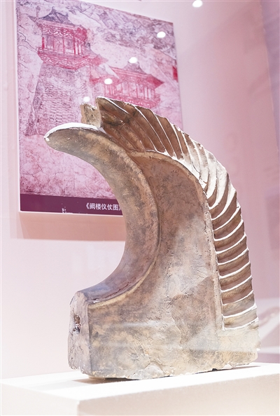 本次展览中,陕西省咸阳市礼泉县昭陵祭坛出土的鸱尾高64厘米、长40.5厘米、宽25厘米,引人瞩目。姜涛解释说,鸱尾是中国古代建筑屋脊正脊两端的一种饰物。相传鸱鸟是龙生九子之一,好在险要处张望,也喜欢吞火。古人塑其形象在殿角、殿脊、屋顶之上,用以避火。从这件鸱尾可以遥想唐时昭陵前建筑的宏伟壮观。