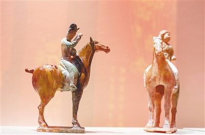 “由于唐代对西域的有效经营和管辖,形形色色的胡人沿着繁荣畅通的丝绸之路大量入华,留居长安。唐长安城宫廷内外充任侍卫的不仅仅有汉人,还有相当一部分的人有着胡人血统。”姜涛向观众仔细介绍起咸阳市礼泉县段简璧墓出土的彩绘胡人骑马俑,骑马的胡人高鼻深目,络腮胡须,身着红色翻领胡服,头戴颜色鲜艳的卷沿虚帽,手做持缰绳状,很可能是当时担任侍卫的胡人。