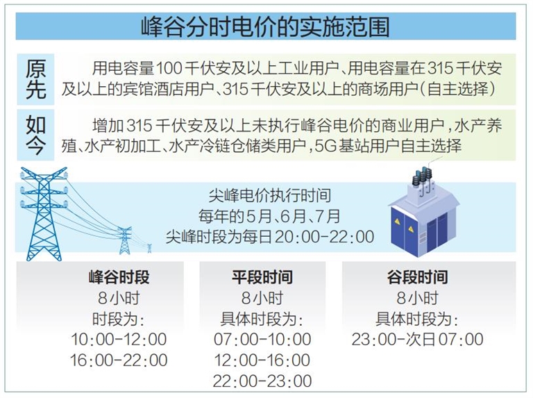 根据《通知》,峰谷分时电价的实施范围将扩大,范围将由原来的用电容量100千伏安及以上工业用户、用电容量在315千伏安及以上的宾馆酒店用户、315千伏安及以上的商场用户(自主选择),增加315千伏安及以上未执行峰谷电价的商业用户,水产养殖、水产初加工、水产冷链仓储类用户,5G基站用户自主选择执行峰谷分时电价政策。符合自主选择执行峰谷分时电价政策的用户需提前十五日向当地电网企业申请,电网企业完成业务办理后于次月起执行,执行周期需保持12个月不变。