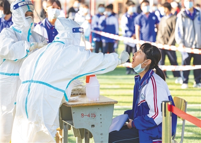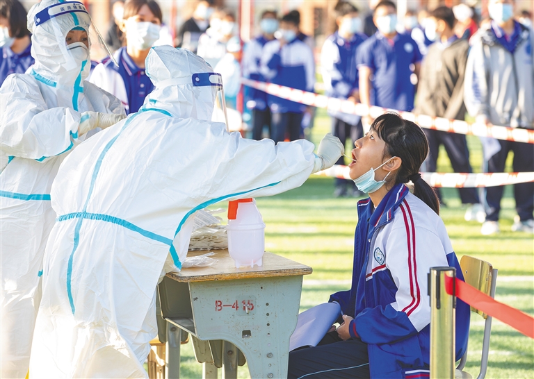 12月22日上午,在万宁中学,医务人员为学生进行核酸检测。当天,万宁市抽调8个镇(区)相关人员集中在万城镇开展万人核酸检测演练,完成13090人核酸采样。文/本报记者 张惠宁 通讯员 朱乃飞 图/本报记者 袁琛
