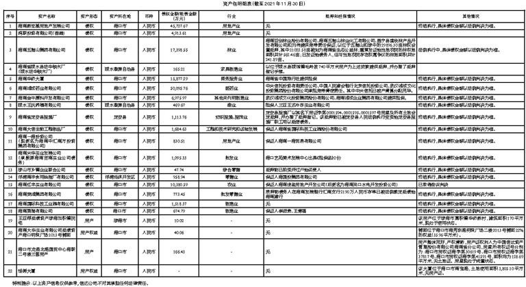中国信达资产管理股份有限公司海南省分公司拟对海南新宏基房地产发展公司等18户债权、4套房产和2户房产权益进行处置。截至2021年11月30日,该资产包债权总额为160,701.83万元,抵债总额为216.52万元。该资产包中的债务人主要分布在海南省海口市和定安县等地区。
