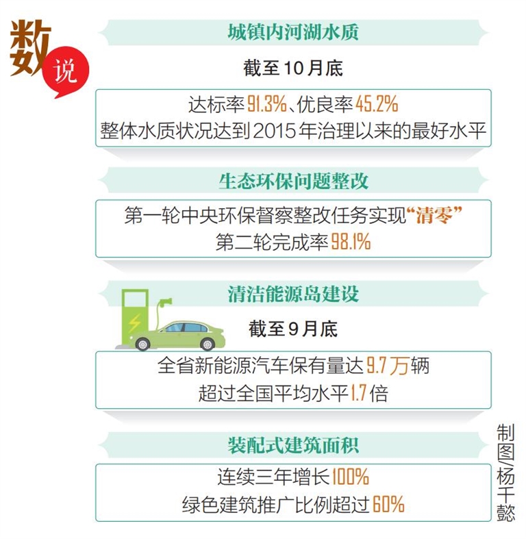 又如,清洁能源岛建设扎实推进,截至9月底全省新能源汽车保有量达9.7万辆,超过全国平均水平1.7倍。我省装配式建筑面积已连续三年增长100%,绿色建筑推广比例超过60%。