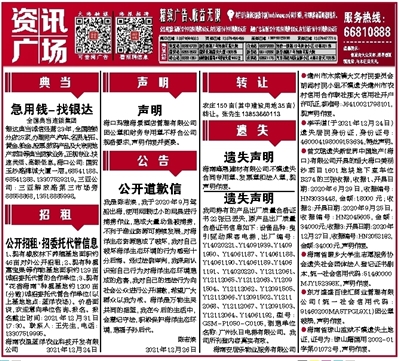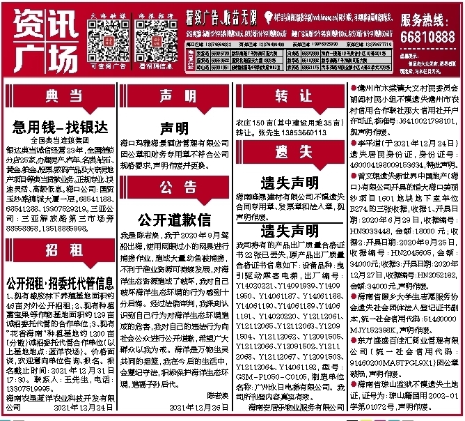 ●李平道(于2021年12月24日)遗失居民身份证,身份证号:460004198009153634,特此声明。
