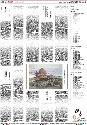 父亲的母语是军话,那是我老家岛西诸种方言中之一种。这种据说是由汉代朝廷派遣的戍边军队所传的方言,其词汇及组合不少与当下通行的普通话相同或相近,语音则近似于广西桂林官话。从出生至入学读书,父亲一直在故乡度过,以为普天下都说与其母语军话相同的语言。及至入学读书,方晓得这个世界竟然还有其他全然陌生的话语。那时故乡已设有新式学校,他的语文老师是琼山人,上课打比方时喜欢插入几句琼山话段子,并详尽地解释其中的含意。每逢这时,从老师口中流荡出来的是琼岛北部的腔调。比之于军话,琼山话语调低沉而顿挫,铿锵而柔韧。父亲听着竟在脑子里生出种种想象:兴许琼北那里的海风凛冽而温煦,雄鸡唱晓沉雄激越,鸟的啁啾也是含蓄而起伏。于是父亲决意要学会琼山话。他任班长,课余时间便有了与老师接触的机会,他总是设法让老师用琼山话与他交流。每逢从老家府城探亲归来,老师总是以琼山话将许多故乡刚发生的奇闻逸事说给父亲听。父亲听得津津有味,眼珠子却骨碌碌地转,他其实在心中嗫嚅着,默默在用心记着老师的发音和语调呢!不消半年,父亲便有腔有调地会讲老师在课余时间里传递给他的“外语”。至此,父亲大体上已学会了讲琼山腔海南话。琼山方言挂在父亲嘴上,如同琼北乡邑投给他一张无形的请柬。父亲那时年轻,心骛着外面多彩的世界。如今学会讲琼山话,脑子里不时升腾起纵横外乡的遐想:待到学业结束时,就到琼北闯荡一番,开开眼界。