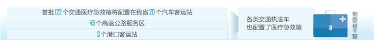 据悉,122个交通医疗急救箱将配置在我省20个汽车客运站、45个高速公路服务区、3个港口客运站,各类交通执法车也配置了医疗急救箱。根据工作计划,明年开始我省还将陆续在二级汽车客运站和港口客运站配备医疗急救箱,交通医疗急救箱和急救设备配置范围将进一步扩大。