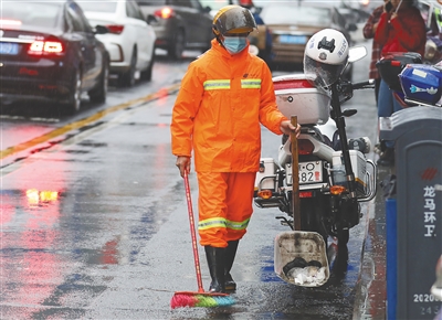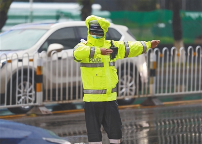 因冷空气侵袭,我省进入“降温+降雨”的湿冷模式。在寒风冷雨中,交警、环卫工人等坚守在岗位上,做好城市交通管理和市容清洁工作。左图:12月26日,海口市龙华区金龙路,交警在疏导交通。右图:12月26日,环卫工人在清扫金龙路街面上的垃圾。本报记者 李天平 摄