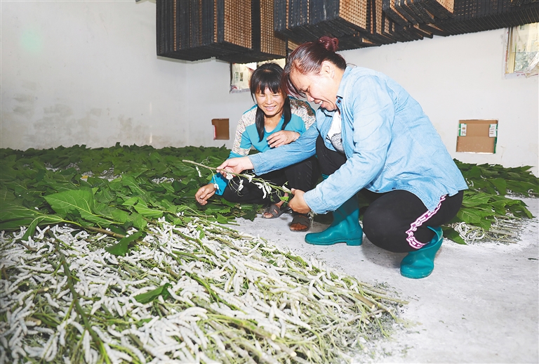 通过“政府+公司+村委会+合作社+农户”的模式,更丰村建设扶贫产业基地,以村集体经济为发展重点,因地制宜发展种桑养蚕产业。这既调整了村里的产业结构,带动农户就业、稳定增收,也让生态环境得到改善。