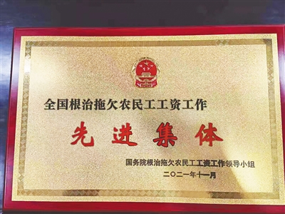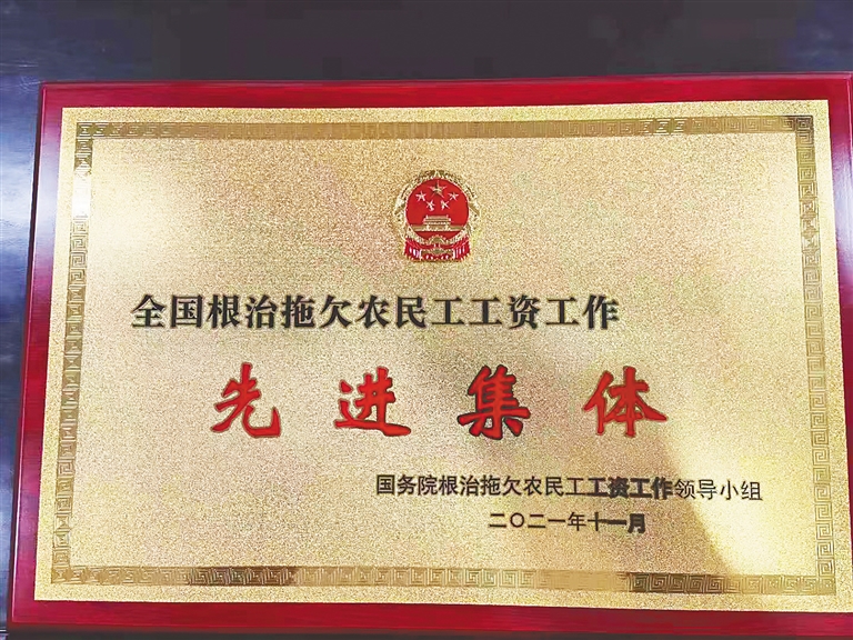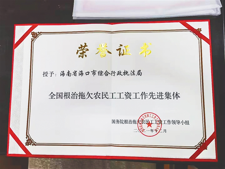 为表彰先进典型、弘扬正能量,进一步增强根治拖欠农民工工资工作战线广大干部职工的荣誉感、责任感、使命感,营造崇尚先进、学习先进、争当先进、赶超先进的浓厚氛围,12月24日,国务院根治拖欠农民工工资工作领导小组组织召开全国根治拖欠农民工工资工作电视电话表彰会议。会上,海口市综合行政执法局被授予“全国根治拖欠农民工工资工作先进集体”荣誉称号。海口市综合行政执法局党组书记、局长冯勇作为代表领奖。