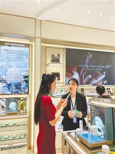 12月25日,周六,三亚海旅免税城人流如织,位于三楼的美妆区人气最旺。免税品销售专员郑子音站在海蓝之谜门店门口,笑迎每一位顾客。