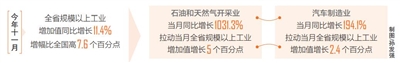 从行业大类看,超五成工业行业实现增长。11月,全省36个大类行业中,有20个行业增加值实现增长,实现两位数增长的行业有8个。其中,石油和天然气开采业当月同比增长1031.3%,拉动当月全省规模以上工业增加值增长5个百分点;汽车制造业当月同比增长194.1%,拉动当月全省规模以上工业增加值增长2.4个百分点;农副食品加工业,烟草制品业增长,电力、热力生产和供应业当月分别同比增长52.0%、42.5%、8.2%。