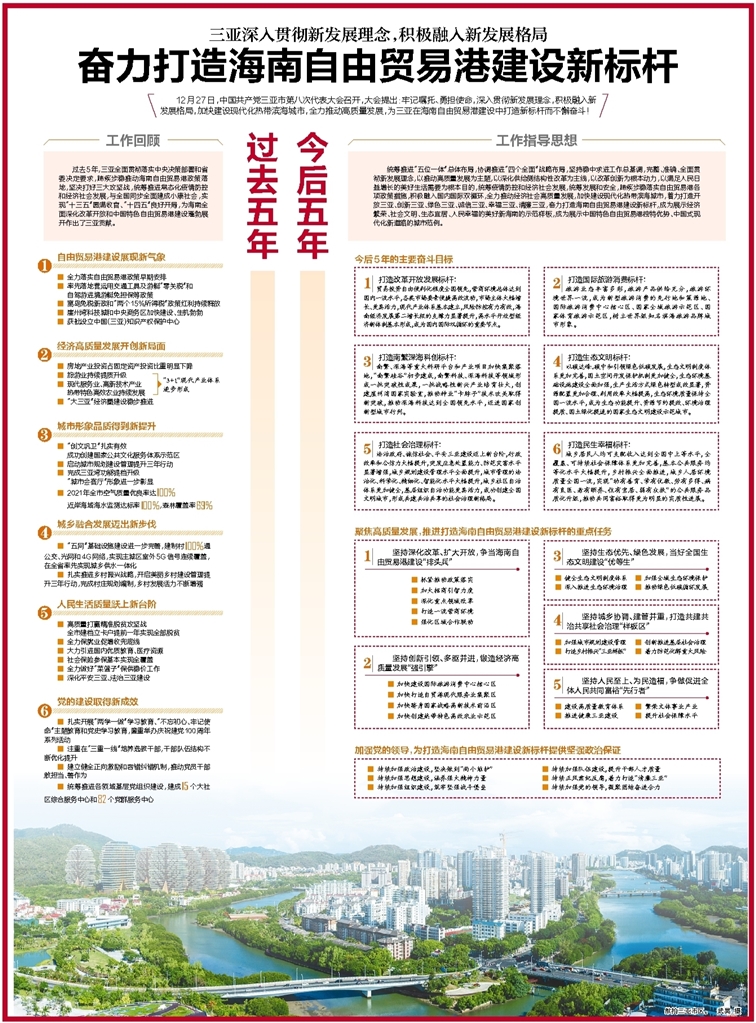 12月27日,中国共产党三亚市第八次代表大会召开,大会提出:牢记嘱托、勇担使命,深入贯彻新发展理念,积极融入新发展格局,加快建设现代化热带滨海城市,全力推动高质量发展,为三亚在海南自由贸易港建设中打造新标杆而不懈奋斗!