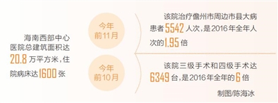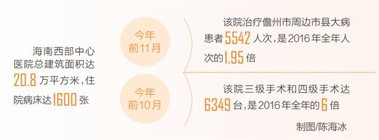 从上海引进全国优质医疗资源、初步打造成海南西部区域医疗中心,造福儋州市百万市民、海南西部市县300万居民,有效破解长期以来困扰儋州市民“大病出市”的看病难题。2021年1月至11月,海南西部中心医院治疗儋州市周边市县大病患者5542人次,是2016年全年人次的1.95倍;2021年1月至10月,该院三级手术和四级手术达6349台,是2016年全年的6倍。