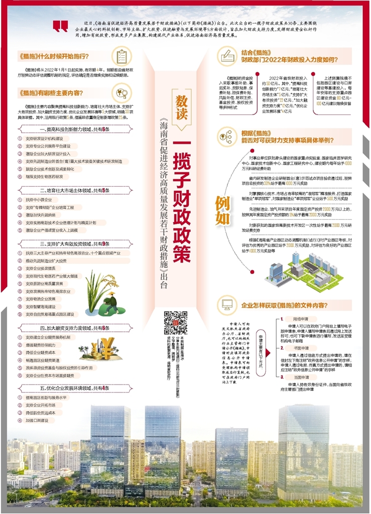 近日,《海南省促进经济高质量发展若干财政措施》(以下简称《措施》)出台。此次出台的一揽子财政政策共30条,主要围绕企业最关心的科技创新、市场主体、扩大投资、促进融资与发展环境等5方面设计,旨在加大财政支持力度,发挥财政资金杠杆作用,增加有效投资,形成更多产业集聚,构建现代产业体系,促进海南经济高质量发展。