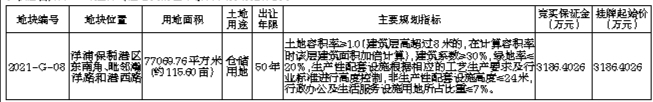 二、竞买人资格:竞买人资格。除法律法规另有限制以及存在在洋浦经济开发区区内因自身原因造成土地闲置或拖欠土地出让金行为的以外(注:失信被执行人不得参加本次竞买),符合下列条件的中华人民共和国境内外的法人和其他组织,均可申请竞买,本次挂牌不接受联合申请。(一)同一竞买人只能提交一次竞买报名(同一法定代表人视为同一名竞买人,报名名称与缴纳竞买保证金账户名称必须一致)。(二)竞买人注册资本金不少于1亿美元或等额人民币。(三)申请参加的竞买者须已阅知《海南省产业项目发展和用地准入协议》对于本宗土地约定的开工时间、投资、产出、税收强度等相关内容的要求,提出书面竞买申请,并按照《竞买须知》的要求提供相关文件。三、宗地开发建设要求:(一)根据产业规划,本次挂牌出让的宗地主要用于港航物流供应链产业。(二)参照《海南省建设用地出让控制指标(试行)》(琼国土资规〔2018〕7号)文件确定的标准,在项目达产后,3年累计的纳税总额不低于12720万元人民币(平均每年土地税收贡献率不低于 35 万元/亩),3年累计产值不低于 360000万元人民币(亩均年产值均不低于 1000 万元),实现就业约300人。项目所产生的产值、税收等数据纳入洋浦经济开发区统计口径。(三)本次挂牌出让的宗地已具备开发建设条件。竞得人应在按现状交地后4个月内动工,24个月内完成项目建设并投产。从出让合同约定动工之日起满一年未满两年不动工开发的,按土地出让价款的20%征收土地闲置费;闲置满两年的,报洋浦经济开发区管理委员会批准依法无偿收回土地使用权。项目设计施工应符合国家、海南省和洋浦经济开发区的有关管理规定。(四)本次挂牌出让的宗地应按照装配式建筑有关规定的要求进行开发建设。四、本次国有建设用地使用权挂牌出让采取增价方式竞价,每次增价幅度为人民币10万元或10万元的整数倍递增。按价高且不低于底价者的原则确定竞得人。五、竞买咨询及报名期限:本次挂牌出让的详细资料和具体要求,详见挂牌出让手册。申请人可于2022年1月4日至2022年1月27日到海南省洋浦经济开发区洋浦迎宾大道洋浦大厦1420室洋浦经济开发区规划建设土地局或海南省公共资源交易服务中心一楼受理大厅3号窗口(土地产权交易)购取挂牌出让手册和提交书面申请。六、竞买保证金及资格确认:申请人交纳竞买保证金的截止时间为2022年1月27日17时00分(以竞买保证金到账为准)。经审核,申请人按规定交纳竞买保证金,具备申请条件的,我局将在2022年1月27日17时30分前确认其竞买资格。七、挂牌报价时间及地点:挂牌时间:2021-G-08地块:2022年1月20日8:00 -2022年1月29日17:00。挂牌现场会时间:2021-G-08地块:2022年1月29日17:00。挂牌地点:海南省公共资源交易服务中心土地交易厅。八、其他需要公告的事项:(一)该宗土地上含有2栋建筑物,为1995年洋浦国际海员娱乐城项目建设的烂尾楼,一栋地下1层、地上11层,建筑面积为10143.36平方米,另一栋地下1层、地上2层,建筑面积为2570.51平方米。2栋建筑物评估总价值为1206.5737万元。竞得人在竞得土地后需支付2栋烂尾楼的1206.5737万元费用。(二)该地块北侧和东侧均有保税港区的物理围网,竞买申请人需充分考虑在该地块拟建项目的出入交通及建筑物的退缩距离等因素。竞买人需充分了解该宗土地上2栋烂尾楼现状,如需拆除,需自费拆除。(三)出让宗地属存量国有建设用地,四至界线清楚、土地权利清晰、安置补偿落实到位、地上附着物已清表、无法律经济纠纷、土地开发利用规划条件明确、符合土壤环境质量要求。该宗地可以满足施工建设所需的水、电供应,相关设备、机械可以进场施工,具备动工开发所必需条件。(四)挂牌期间遵循公开、公平、公正和诚实信用原则,竞买人在同等条件下竞价,按照价高且不低于底价者得原则确定竞得人。挂牌活动结束,竞买人竞得土地后,应当与挂牌人签订《挂牌成交确认书》。由注册在洋浦的公司于20个工作日内与洋浦经济开发区规划建设土地局签订《国有建设用地使用权出让合同》,在签订《国有建设用地使用权出让合同》之日起30日内一次性付清全部土地出让价款。逾期未付清土地出让金的,土地行政主管部门有权依法解除合同,并由受让人承担相应的违约责任。后续应按法律、法规规定和洋浦经济发展局签订《海南省产业项目发展和用地准入协议》。(五)成交后,竞得人缴纳的竞买保证金转为土地出让金,未竞得者缴纳的竞买保证金在挂牌活动结束后5个工作日内予以退回,不计利息。竞得者违约反悔的,竞买保证金不予退还。(六)竞买成交后10个工作日内在土地有形市场公布出让结果。受让人凭土地出让金发票及完税证明等材料办理不动产登记手续。(七)本次挂牌出让事项如有变更,以届时变更公告为准。(八)本公告未尽事宜详见《洋浦经济开发区国有建设用地使用权挂牌出让手册》,该手册所载内容为本公告的组成部分。九、联系方式:联系地址:海南省洋浦经济开发区洋浦迎宾大道洋浦大厦1420室、海南省公共资源交易服务中心一楼受理大厅3号窗口;联系人:翟先生、蒙先生;联系电话:0898-28829216、0898-68539322;查询网址:http://www.landchina.com;http://zw.hainan.gov.cn/ggzy/;http://lr.hainan.gov.cn。
