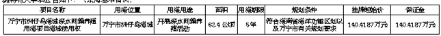 二、竞买人的资格条件及审查办法:1.中华人民共和国境内的法人或其他组织满足以下条件的均可报名参加竞买(除法律、法规另有规定外),申请参加竞买者须提出书面竞买申请,并提供《竞买须知》中要求提供的相关文件。2.本次挂牌活动凡属中华人民共和国境内的法人、自然人和其他组织(除法律另有规定者外)均可申请参加挂牌;本次挂牌不接受联合竞买;竞买者须提供在我省工商及税务部门无不良征信记录证明材料;失信被执行人不得参加本次项目竞买;竞买人须三年内无违规用海情况。3.竞买者须具有从事水产养殖活动资质,具体以营业执照经营范围内容为准。4.提供时点在公告期间不低于人民币200万元的银行资信证明。5.经审查,申请人按规定缴纳竞买保证金且符合竞买人资格与要求的,出让人在报名有效期内确认其竞买资格并出具《竞买资格确认书》。三、挂牌文件获取方式:本次挂牌出让的详细资料和具体要求,详见挂牌出让手册。申请人可于2022年1月27日前到海南美林拍卖有限公司或海南省公共资源交易服务中心一楼受理大厅窗口咨询和购取挂牌出让手册,并按挂牌出让手册的具体要求报名参加竞买。四、挂牌时间、地点、方式:1.交纳竞买保证金(以款到账为准)及提交竞买申请截止时间:2022年1月27日16:00,经审核,申请人具备申请条件的,出让人将在2022年1月27日16:30前确认其竞买资格。2.挂牌时间:2022年1月17日09:00—2022年1月29日9:30。3.挂牌现场会时间:2022年1月29日9:30。4.挂牌地点:海南省政府会展楼二楼省公共资源交易中心交易大厅202。5.挂牌方式:在挂牌时限内只有一个竞买人报价,且报价不低于底价,并符合其他条件的,挂牌成交;在挂牌时限内有两个或两个以上竞买人报价的,采取现场竞价、价高者得(最高价不低于底价)的方式确定竞得人。五、其他事项:1.该项目用海为开放式养殖用海,属于经营性用海,用海面积为62.4公顷,主要用于开展深水网箱养殖活动,深水网箱养殖品种主要为金鲳鱼、军曹鱼以及石斑鱼等。2.项目运营期间,竞得人应在用海区外围设置安全警戒标志,设置相应界标,加强对工作人员的安全教育及提醒,制定应急预案,落实好各项安全保障措施。3.项目运营期间,竞得人须委托有CMA资质的单位定期对项目区域进行海洋环境跟踪监测,跟踪监测结果报市自然资源和规划局、市生态环境局备案。4.项目运营期间,竞得人应严格按照已获批的环境影响报告文件要求,建设相应的海洋环保设施,落实各项海洋环保措施,履行相应的海洋生态环境保护责任,保护好项目海域及周边海域的海洋生态环境。5.如竞得人在竞得前未开展本项目的前期有关工作,竞得人凭向垫资方支付本项目实施前期工作垫付费用(项目前期工作费用为50万元)的有效凭证,办理不动产登记发证手续,否则不予办理。6.竞得人要落实好海洋防灾减灾措施。7.竞得人取得项目海域使用权不动产证后6个月内,网箱建设投产的总投资需达2000万元,建成24口圆形重力式全浮网箱(每口网箱周长80米,直径约25.5米,网身约10米,面积约509平米,容积约5090平米),并投入项目海域进行生产。8.如出现项目海域使用权连续闲置满2年及以上情况,将由万宁市自然资源和规划局上报市政府同意后,依法依规办理项目海域使用权无偿收回手续。9.挂牌出让成交的,挂牌服务费由竞得人按挂牌出让成交价的5%向代理机构直接缴纳(最高不超过30万元)。10.其它未尽事宜按照海域管理、海洋环境保护等有关法律法规执行。六、联系地址:海口市龙华区金贸西路环海大厦公寓楼二单元15B;电话:0898-68570895;网址:http://zw.hainan. gov.cn/ggzy/。