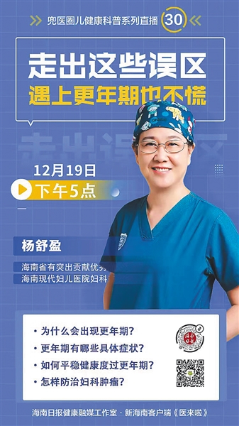 12月19日,海南日报健康融媒工作室推出《大医精讲》系列直播第30期,特邀海南省有突出贡献优秀医生、海南现代妇女儿童医院妇科主任杨舒盈,为广大网友科普更年期知识。