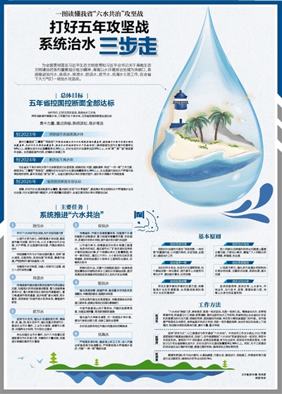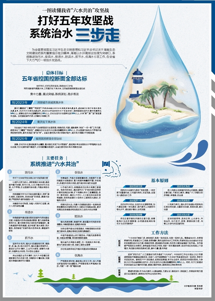 为全面贯彻落实习近平生态文明思想和习近平总书记关于海南生态文明建设的系列重要指示批示精神,海南以水环境综合治理为突破口,系统推进治污水、保供水、排涝水、防洪水、抓节水、优海水6项工作,在全省下大力气打一场治水攻坚战。