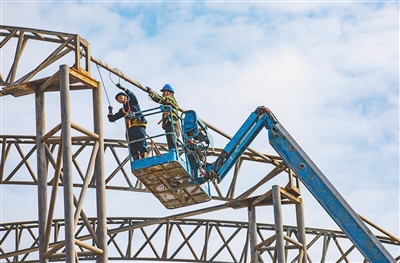 1月2日,在迈湾水利枢纽工程筛分拌合系统建设现场,工人在进行高空作业。