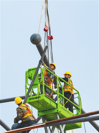 近日,海口新海港客运综合枢纽站项目建设者们在进行施工作业。目前,该项目总体施工进程已过半,屋面钢结构网架拼装已完成近90%