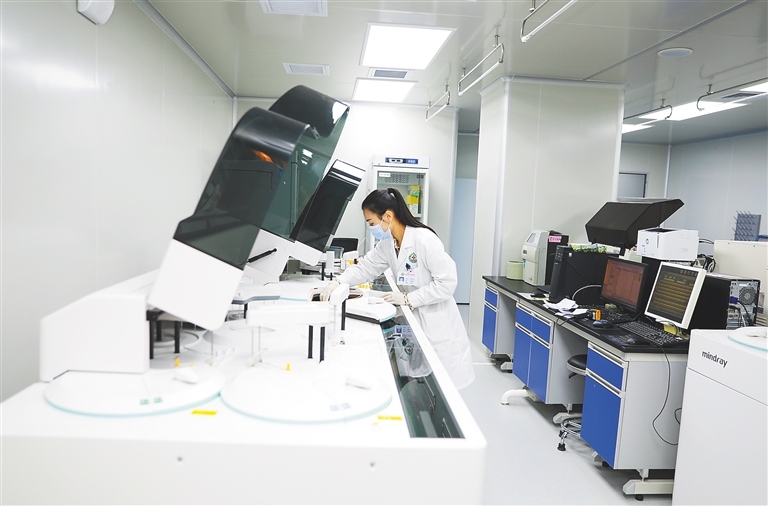 1月8日,屯昌县中医医院新院区,医务人员在操作生化免疫流水线设备。当天,屯昌县中医医院新院区正式落成并投入使用。该院集医疗、教学、科研、康复、保健、养生等功能于一体,今后将交由海南省中医院托管。以省中医院托管为契机,屯昌县中医医院将加大人才引进和人员培养力度,加强针灸科、康复医学科、骨外科、妇产科、儿科、重症医学科等重点学科建设,提高医疗质量和服务水平。文/本报记者 李梦瑶 图/本报记者 李天平