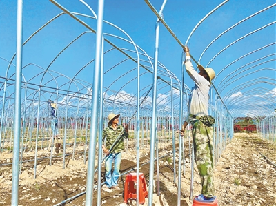 1月11日,在三亚市崖州区的国家现代农业产业园农作物新品种新技术田间展示推广中心,海南农垦南繁集团有限公司组织工人搭建农作物大棚。