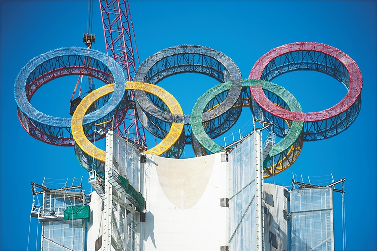 近日,位于北京冬奥会延庆赛区的“海陀塔”上的奥运五环结构吊装作业完成,进入工程收尾阶段。塔顶设置奥运五环标志,表面安装了共计7万余个白色点光源,塔身加装飘带形装饰。