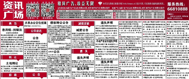 ●欧晓敏(于2022年1月14日)遗失居民身份证,号码:46010419890405032X,特此声明。