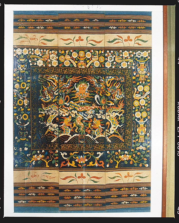 此龙被由三幅彩锦连缀而成。主体图案为“五龙出海”图,龙舞沧海,气势恢宏;外圈饰以花鸟博古图,寓意“锦上添花”。此龙被构图严谨,层次分明,图案生动,色彩丰富,工艺精良,品相完好,为现存龙被中的精品。