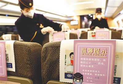 图为1月16日,乘务员在上海虹桥开往汉口的G1724次列车上布置消毒提示卡。 新华社发