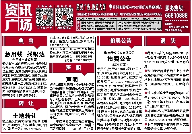 银达典当诚信经营23年,全国连锁分店25家,办理房产、汽车、名表、钻石、黄金、铂金、股票、数码产品及大宗房地产项目等典当贷款业务。正规专业、快速灵活、高额低息。海口公司:国贸玉沙路椰城大厦一层。电话:68541188、68541288、13307529219。三亚公司:三亚解放路第三市场旁,电话:88558868,13518885998。