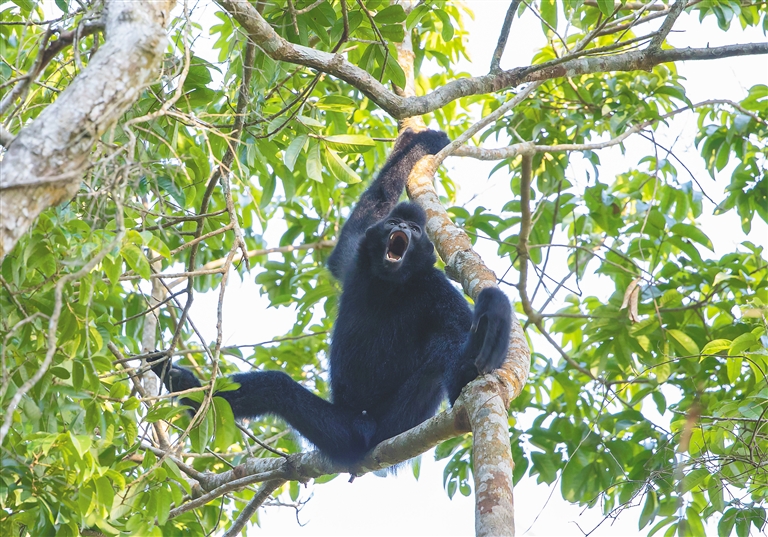 “呜”——这是海南长臂猿最具标志性的鸣声。每天清晨,雄猿带头吹响“起床集结号”后,树冠间紧接着会多出雌猿的几声颤音,音量由低到高,继而形成嘈杂的“合唱”,声音一阵高过一阵。