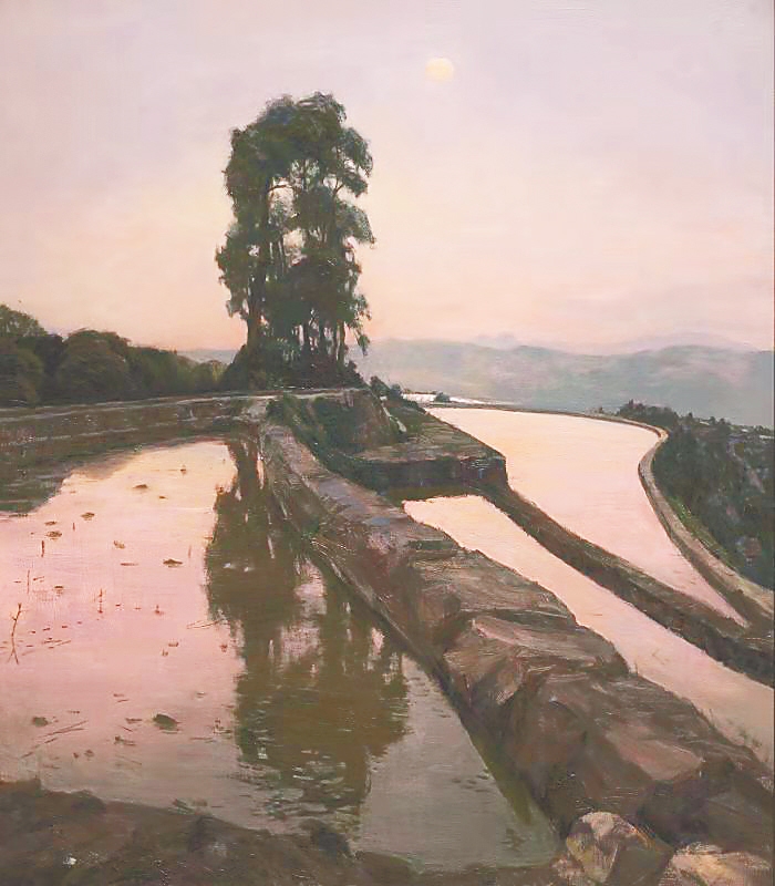 例如张祖英的《日落辉煌》《群山初醒》《薄暮初上》等作品,表现了中国西南梯田的自然与生活的景象,画家抓住梯田群山间日落、日出的瞬间色调变化,营造出独特的意象世界,辽阔而深远,瑰丽而神奇,表达了自己对于自然的崇敬、向往和赞美。