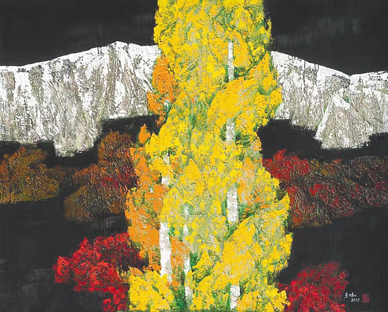 第二代油画家苏天赐吸收中国画的写意性用笔而具有大写意特质,其参展作品《霜晨》从生活的感悟出发,以强烈夸张的橙色为主调,营造出层林尽染的深秋意象,别具苍润幽深的诗意之境。