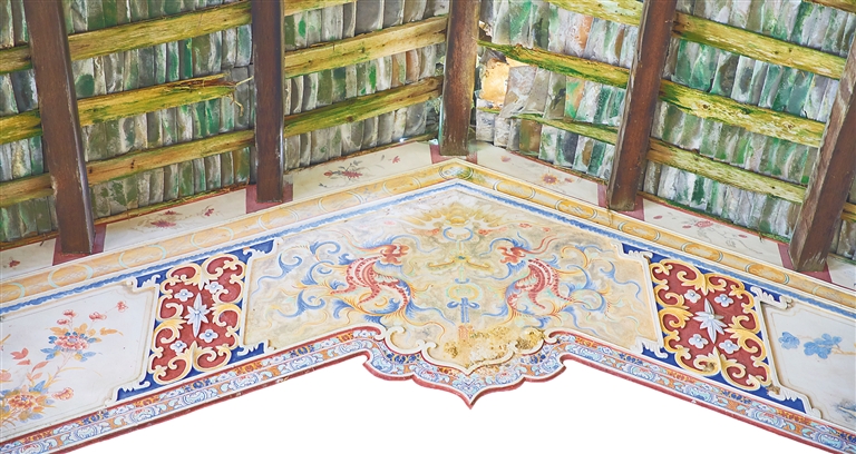 过去,画师们使用的颜料都是天然矿物质石粉,色彩只有土黄、土红、奶蓝、墨色4种基本色,优点是固色持久,可以保持几十年,甚至上百年。