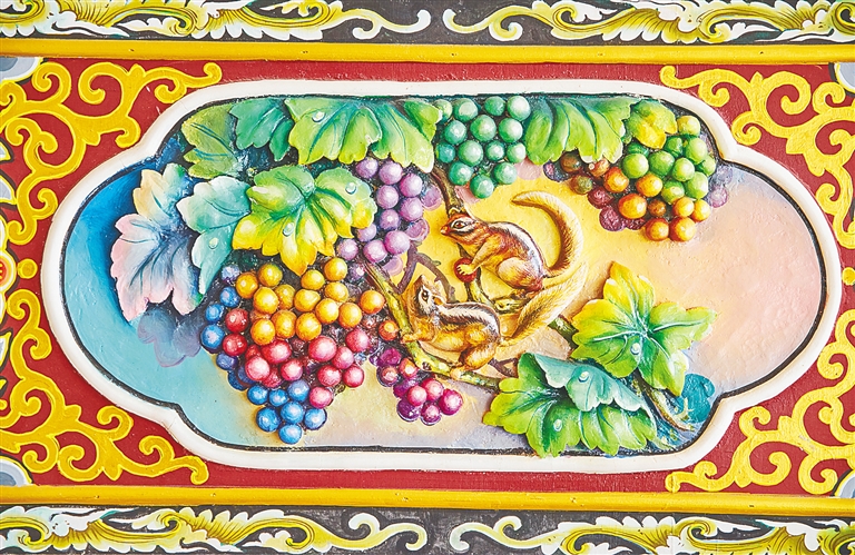 徜徉在文昌老街和古村落,除了平面的壁画外,也会常常见到一种凸出于平面的雕塑。例如松鼠与葡萄,寓意人丁兴旺;蝙蝠与寿桃,寓意多福多寿。这就是灰塑,它也是民屋壁画的一种表现形式。