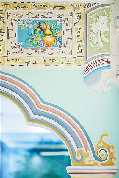 海口中山路有一家骑楼建筑酒店,内部随处可见精美的灰塑和壁画。这是许达联和朋友们的作品。