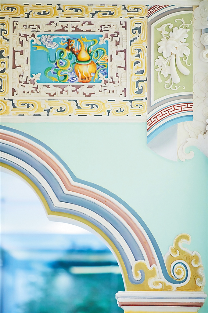 与平面壁画一样,灰塑同样历史悠久,是我国传统建筑中常用到的一种装饰手艺,民间称之为灰批、灰堆。灰塑手艺人根据建筑空间和装饰部位的需要来设计相应的图案,然后将石灰、纸、稻草等调配成类似水泥一样黏稠的原料,通过灰刀将其砌抹在墙面上,进而雕琢形成立体装饰。灰塑题材通常以祥禽瑞兽、花卉植物、吉祥图文等纹样组成,多以民间喜闻乐见的吉祥寓意元素为主。