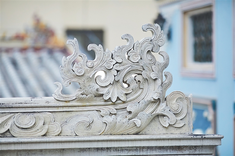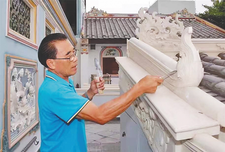 灰刀在手里飞舞了50多年,许达联参与过许多项目。文昌孔庙屋脊上的精美灰雕,就是他参与制作的,历经几十年风雨,如今依然栩栩如生。