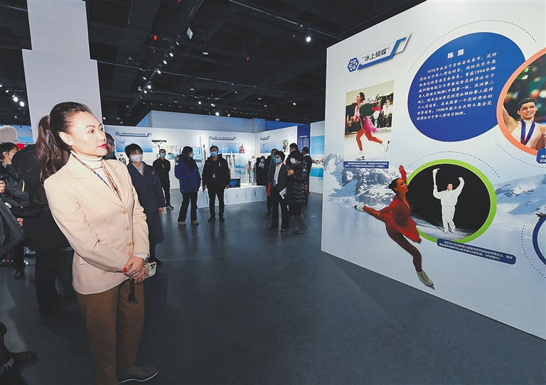 图为北京冬奥组委运动员委员会委员、花样滑冰世界冠军陈露(前)在展板前驻足观看。 新华社记者 李贺 摄