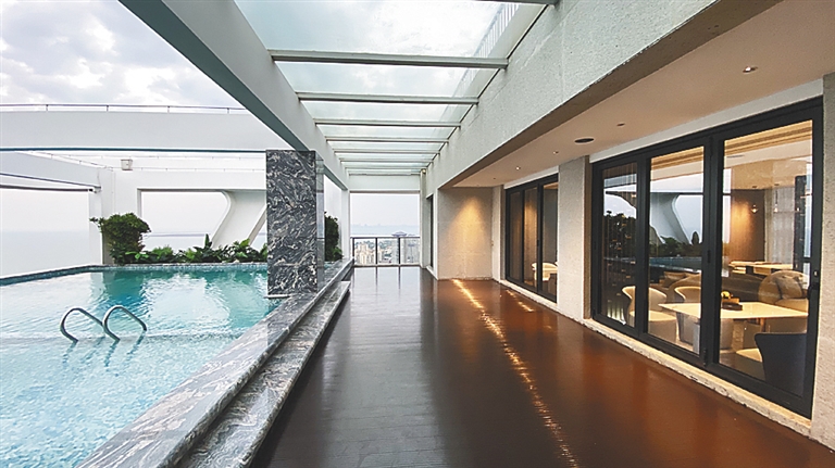 参加开放盛典的嘉宾纷纷在活动现场拍照打卡留念。海域阳光云端营销中心在百米高空打造空中无边际泳池,嘉宾们在池畔共享休闲时光。