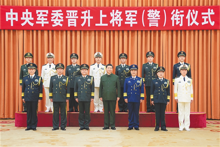 晋衔仪式在嘹亮的军歌声中结束。随后,习近平等领导同志同晋升上将军衔警衔的军官警官合影。