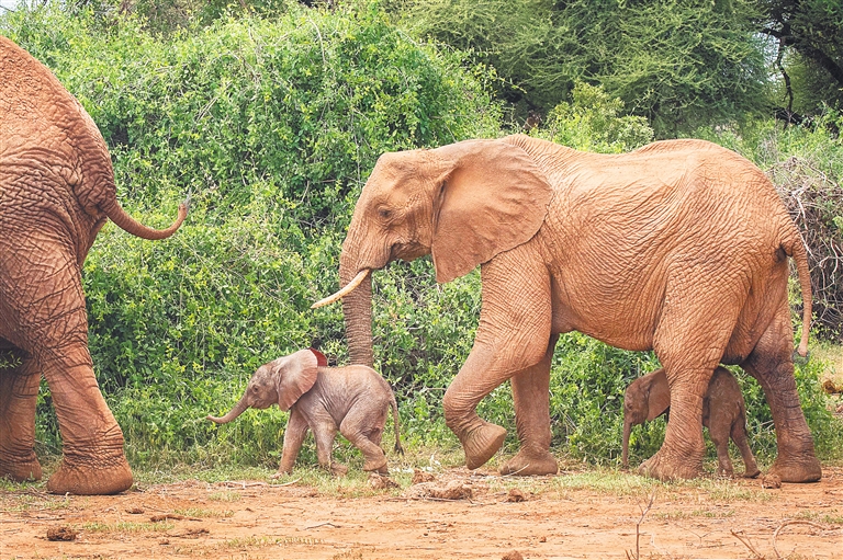 1月17日,在肯尼亚桑布鲁野生动物保护区,小象双胞胎和象妈妈走在一起。
