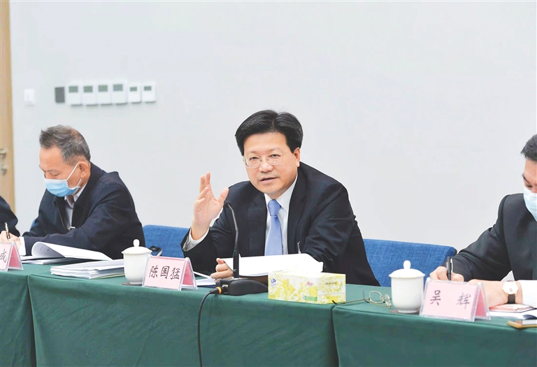 1月21日,参加省六届人大五次会议的代表分组审议政府工作报告。图为陈国猛代表参加澄迈代表团审议。本报记者 王凯 摄