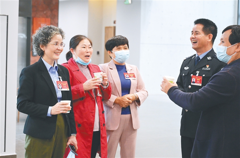 几位人大代表在会议间隙交流讨论。本报记者 王凯 摄