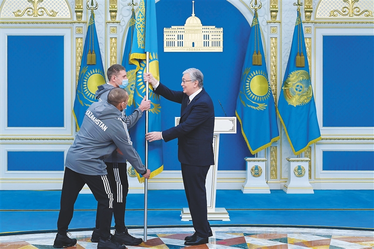 据哈总统府网站消息,托卡耶夫当天在总统府接见参加北京冬奥会的哈萨克斯坦代表团,并将哈萨克斯坦国旗交到代表团成员手中。