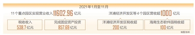 本报海口1月23日讯 (记者傅人意 通讯员许瑞恒)2021年,海南自贸港重点园区坚持集约集聚,园区主要经济指标完成既定目标,快于序时进度,远高于全省水平,呈现比学赶超、蓬勃发展的局面。2021年1月至11月,11个重点园区实现营业收入11602.96亿元,税收收入538.7亿元,完成固定资产投资857.69亿元。这是海南日报记者1月23日从省发展改革委获悉的。